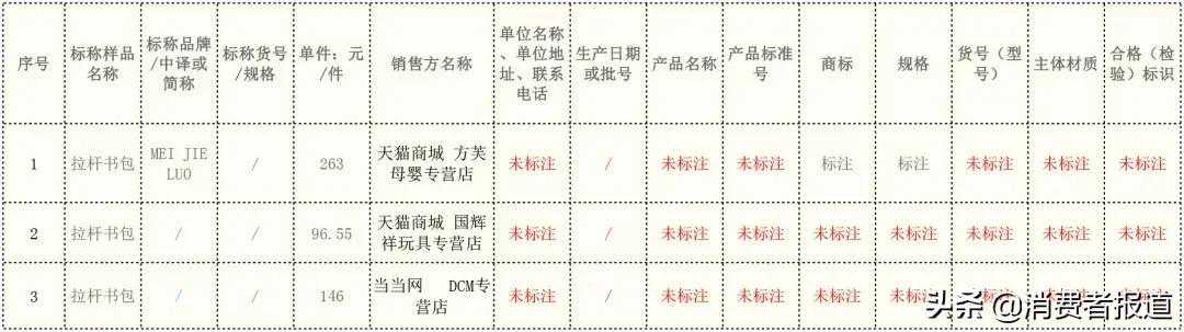 本次比较试验结果显示:在39个批次拉杆箱式学生书包中,有15个批次的样品标志存在不同程度的问题,其中存在比较严重问题的有3个批次,分别为: