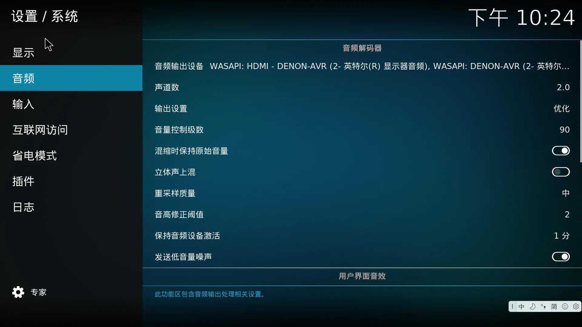 如果要使用遥控器操作的话,建议安装KODI播放器,音频输出同样要选择透传,播放设备选择WSAPI设备,由于杜比全景声是封装在TrueHD或者DolbyDigitalPlus音轨里面的,所以要打开杜比TRUEHD和杜比数字兼容功放。