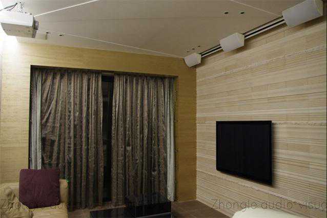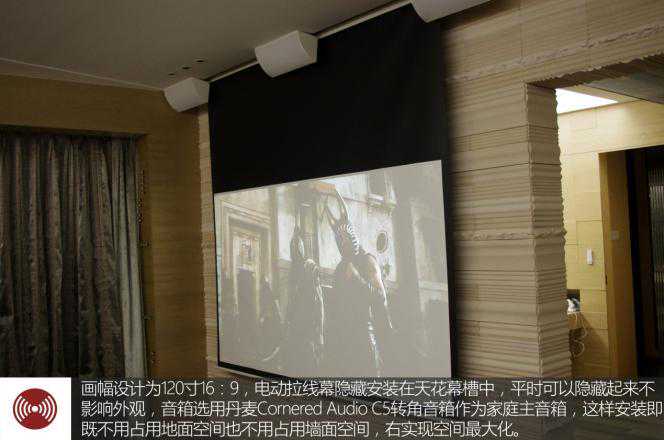 画幅设计为120寸16:9,电动拉线幕隐藏安装在天花幕槽中,平时可以隐藏起来不影响外观,音箱选用丹麦Cornered?AudioC5转角音箱作为家庭主音箱,这样安装即既不用占用地面空间也不用占用墙面空间,右实现空间最大化。