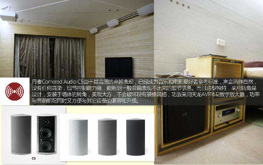 丹麦CorneredAudioC5由于其音质的卓越表现,已经成为音乐和电影爱好者参考标准,声音清静自然,没有任何音染,细节控制能力强,能听到一般音箱表现不出来的细节信息。而且造型独特,采用转角是设计,安装于墙体的转角,美观大方,不会破坏现有装修风格,功放采用天龙AVR1612数字放大器,功率与音箱相配同时又方便与其它设备的兼容和升级。