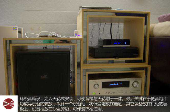 环绕音箱设计为入天花式安装,可使音箱与天花融于一体。最后关键在于低音炮和功放等设备的安放,设计一个设备柜,将低音炮放在最底,其它设备放在机柜的层板上,设备柜放在沙发旁边,可作装饰柜使用。