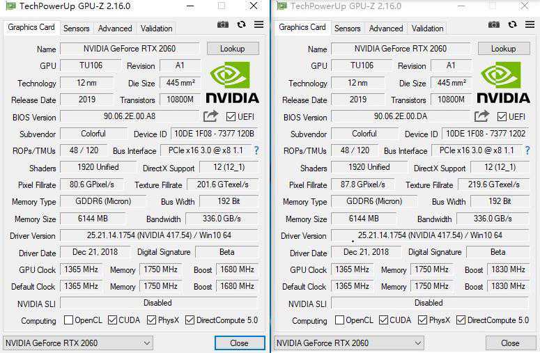 iGameRTX2060VulcanXOC的GPU-Z参数截图。左边是标准的BIOS,参数与公版完全相同,TDP也只有160W。