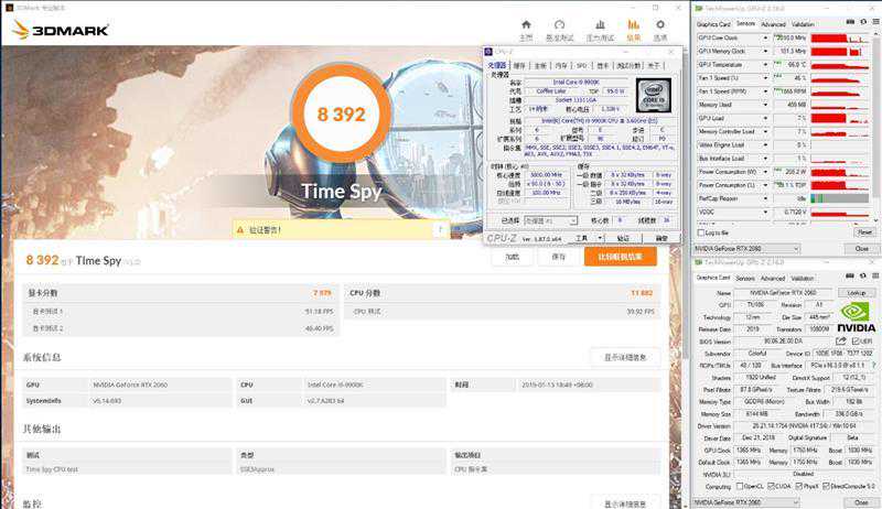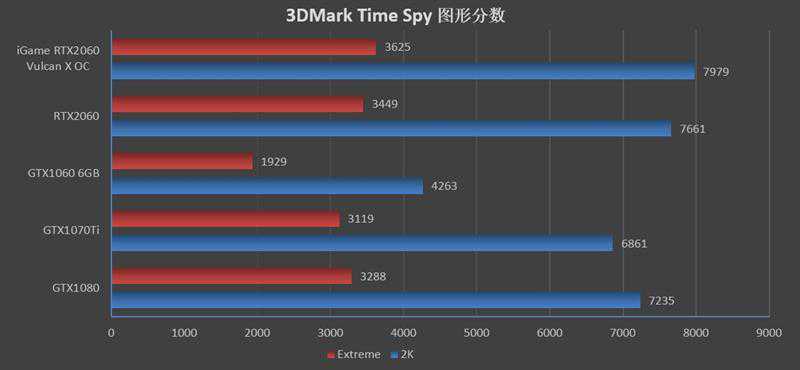 3DMarkTimeSpy测试中,iGameRTX2060VulcanXOC领先公版4%的样子。在2K分辨率下能比GTX1060多3716分,领先幅度达到了87%;相比GTX1080也能多出7分,领先10%。