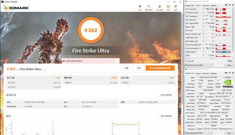 在3DMarkFireStrikeUltra测试中,iGameRTX2060VulcanXOC的图形分数为4329分,最高运行频率2025MHz,最高温度60度,最大功耗181W。