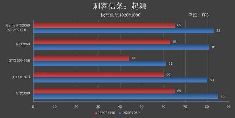 在1080P分辨率下,iGameRTX2060VulcanXOC的帧率为85FPS,比GTX1060快了24帧,比GTX1070Ti快了5帧。