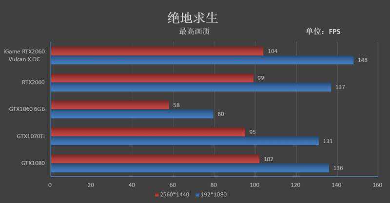 到了2K分辨率,iGameRTX2060VulcanXOC则跑出了104FPS的帧率,领先GTX106046帧,领先GTX1070Ti9帧。