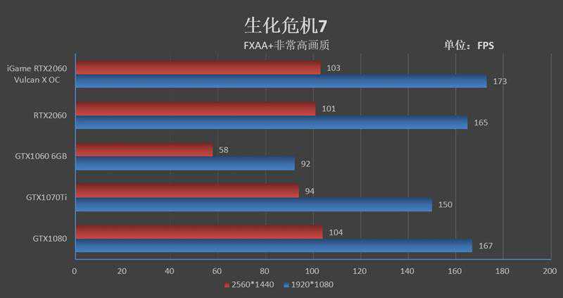 在1080P分辨率下,iGameRTX2060VulcanXOC的帧率为173FPS,比GTX1060快了81帧,比GTX1070Ti快了23帧。
