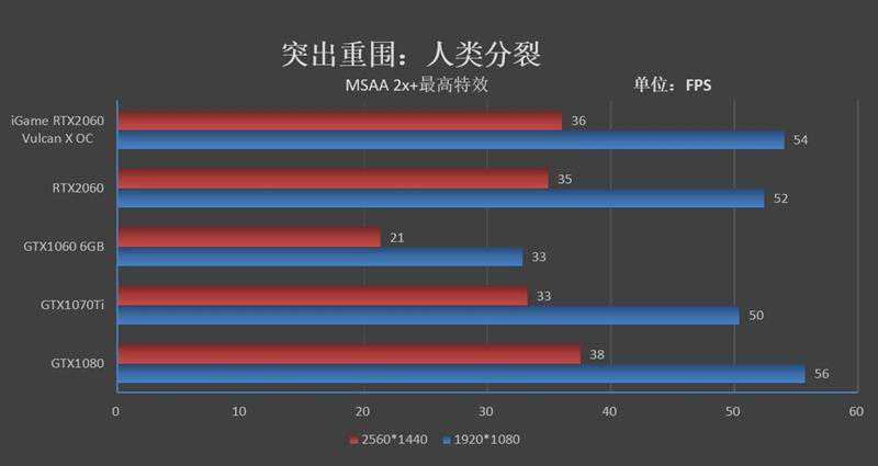 到了2K分辨率,iGameRTX2060VulcanXOC则跑出了65FPS的帧率,领先GTX106021帧,领先GTX1070Ti5帧。