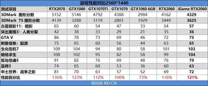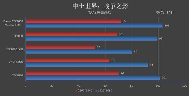到了2K分辨率,iGameRTX2060VulcanXOC则跑出了72FPS的帧率,领先GTX106020帧,领先GTX1070Ti9帧。