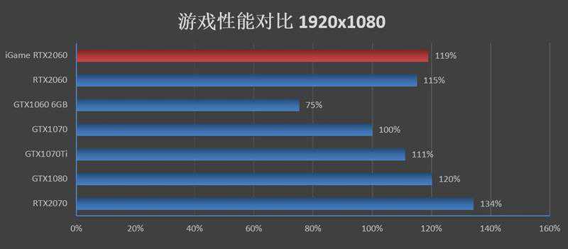 在1080P分辨率下,iGameRTX2060VulcanXOC的帧率为109FPS,比GTX1060快了38帧,领先GTX1070Ti1帧。