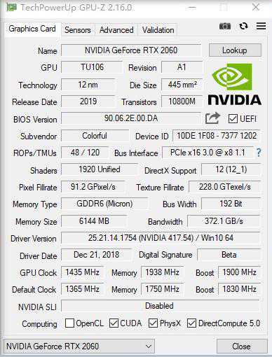 此时iGameRTX2060VulcanXOC的Boost频率达到了1900MHz,显存频率达到了15500MHz,显存带宽372GB/s。