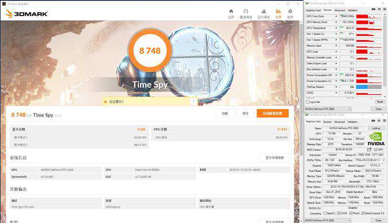 超频之后3DMarkTimeSpy图形分数达到了8365分,比默频的7979高了386分,提升幅度将近5%。最高运行频率2040MHz,最高温度66度,最大功耗209W。