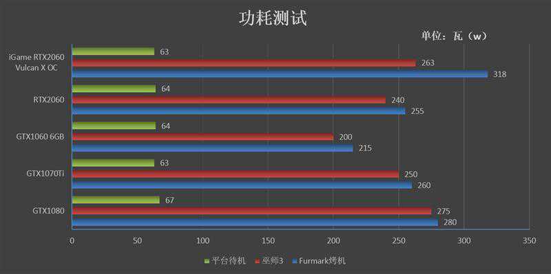从上表可以看出,虽然iGameRTX2060VulcanXOC的烤机功耗达到了310W,比公版高了50多瓦,但是在运行《巫师3》中,功耗只比公版高了20W左右。出现这样的原因是因为iGameRTX2060VulcanXOC在运行FurMark时的由于有巨大的功耗支持,烤机频率高达1845MHz,而公版的烤机频率只有1500MHz左右,二者相差300MHz。如果进一步放开TDP,iGameRTX2060的烤机频率还能继续提升。