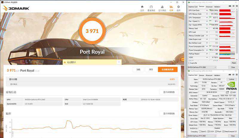 PortRoyal测试时默认使用的是2K分辨率,iGameRTX2060VulcanXOC测得的成绩为3971分,帧率18.39FPS,