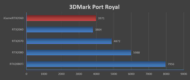在3DMarkPortRoyal测试中,iGameRTX2060VulcanXOC比公版要高了167分,刚好有RTX2080Ti一半的成绩。