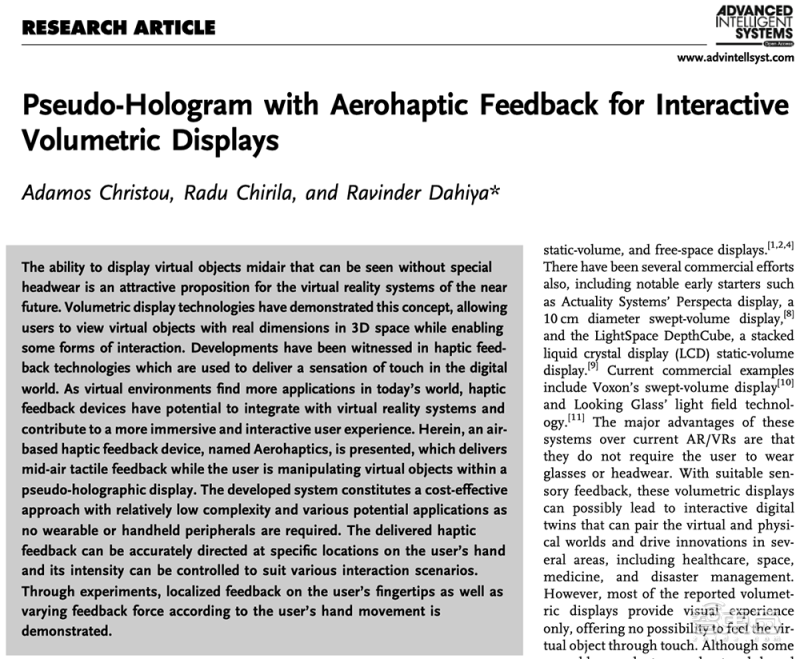 三、比其他全息显示功能更全Aerohaptics系统由格拉斯哥大学詹姆斯·瓦特工程学院的RavinderDahiya教授领导的可弯曲电子和感应技术(BEST)小组开发。