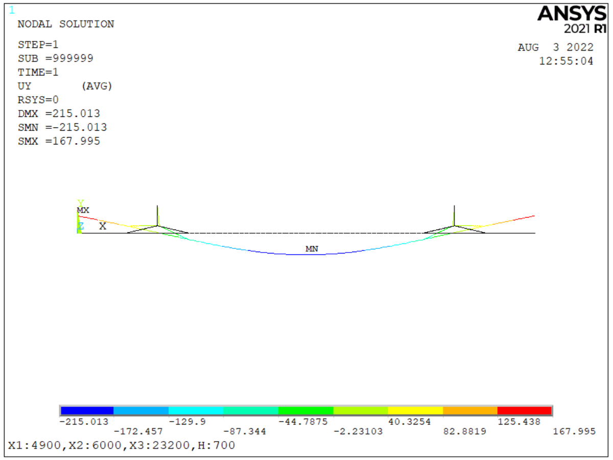 1.计算工况:X1=4.9m,X2=6m,X3=23.2m,H=0.7m的变形情况如下图所示:轨端最大上扬167mm/轨跨中部最大下挠215mm。
