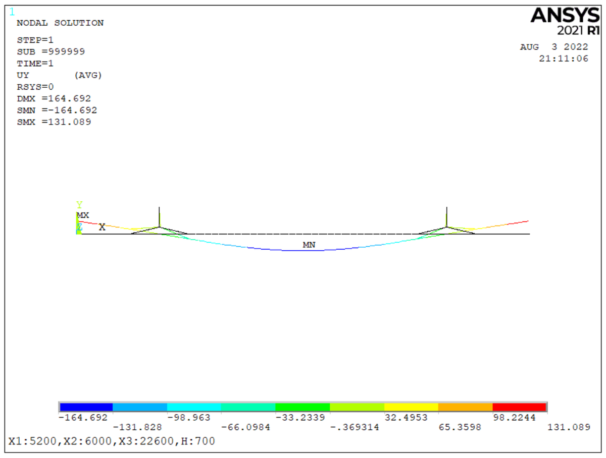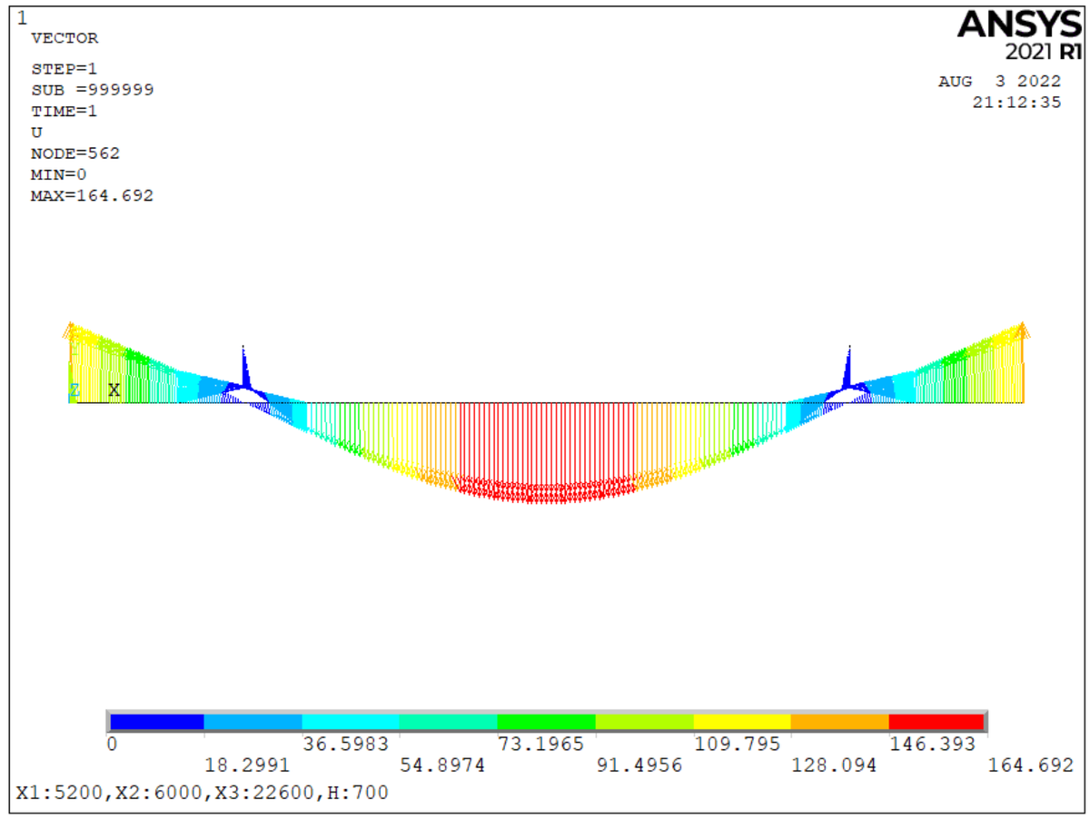 2.计算工况:X1=5.2m,X2=6m,X3=22.6m,H=0.7m的变形情况如下图所示:轨端最大上扬131mm/轨跨中部最大下挠164mm。