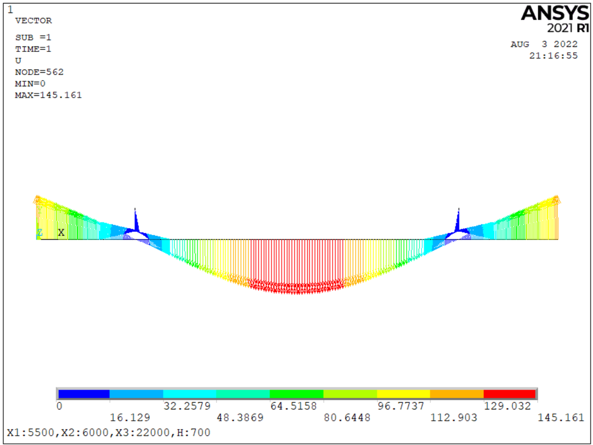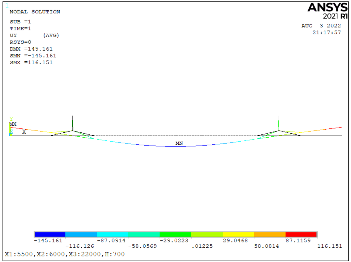 3.计算工况:X1=5.5m,X2=6m,X3=22m,H=0.7m的变形情况如下图所示:轨端最大上扬116mm/轨跨中部最大下挠145mm。