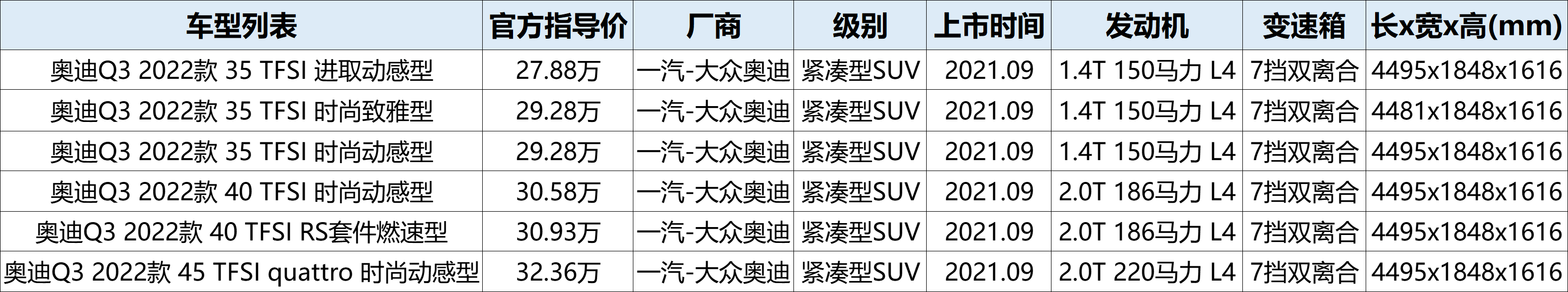 奥迪Q3是奥迪出品的一款紧凑型SUV,主动时尚,运动。Q3是奥迪Q系列家族的第三款车型,第一代于2011年发布,基于PQ35平台打造(同平台车型还有奥迪A3、大众高尔夫等),一经上市就凭借时尚的造型和相对低廉的售价获得不错的销量,热度甚至一度超过奥迪Q5;2013年,奥迪Q3引入国内进行了国产;2016年,奥迪Q3进行了中期改款,一改往日圆润的外观设计风格,这次使用了多边形进气格栅,在多处进行了镀铬装饰,但市场反响平平;2018年,第二代奥迪Q3发布,基于MQB平台打造,延续了奥迪Q8的设计语言,线条感比较浓,同时增加了力量感。当前在售的2022款就属于第二代奥迪Q3,下面就让笔者从配置解读的角度来全面剖析下这款车,看看这车的配置实力表现如何。
