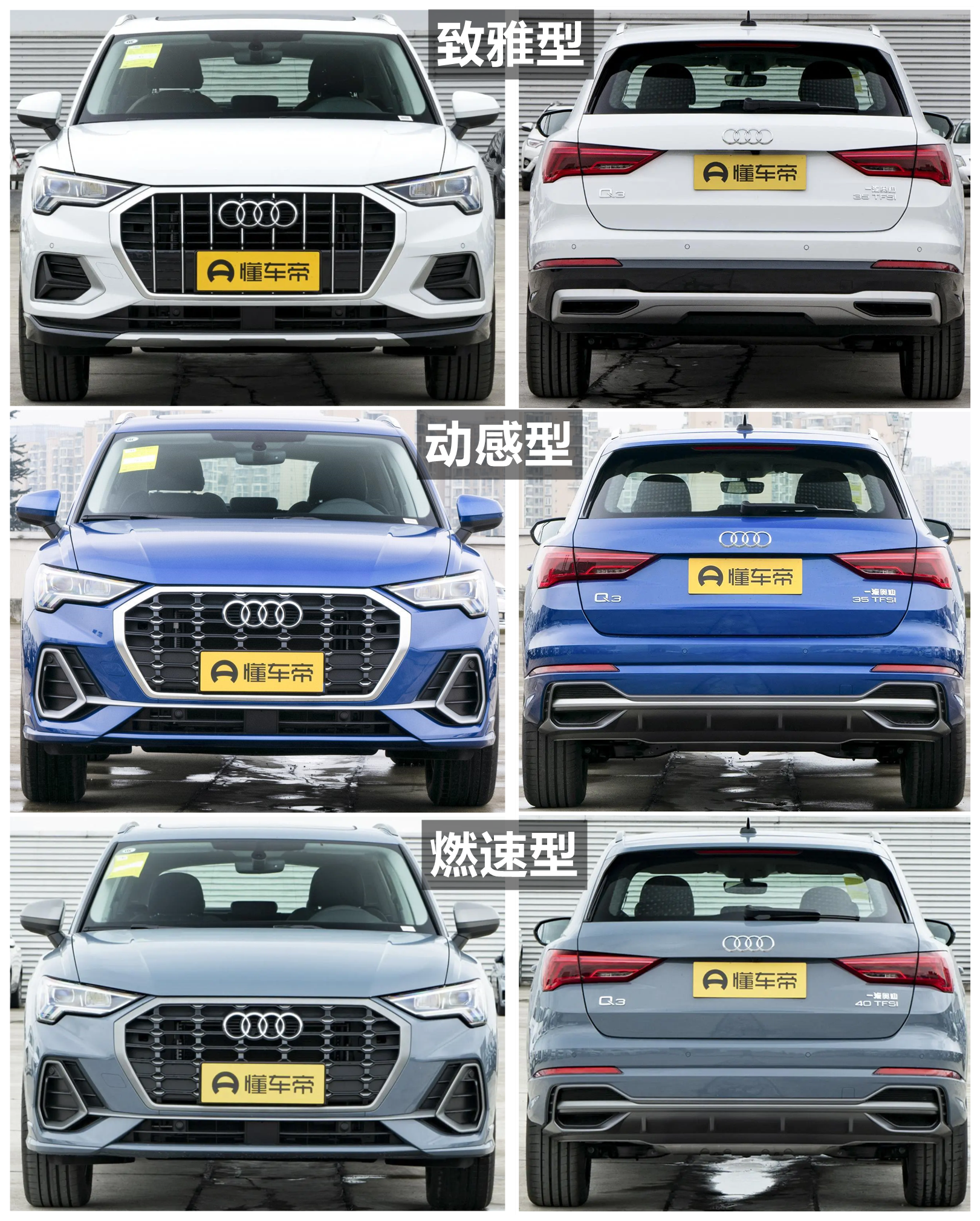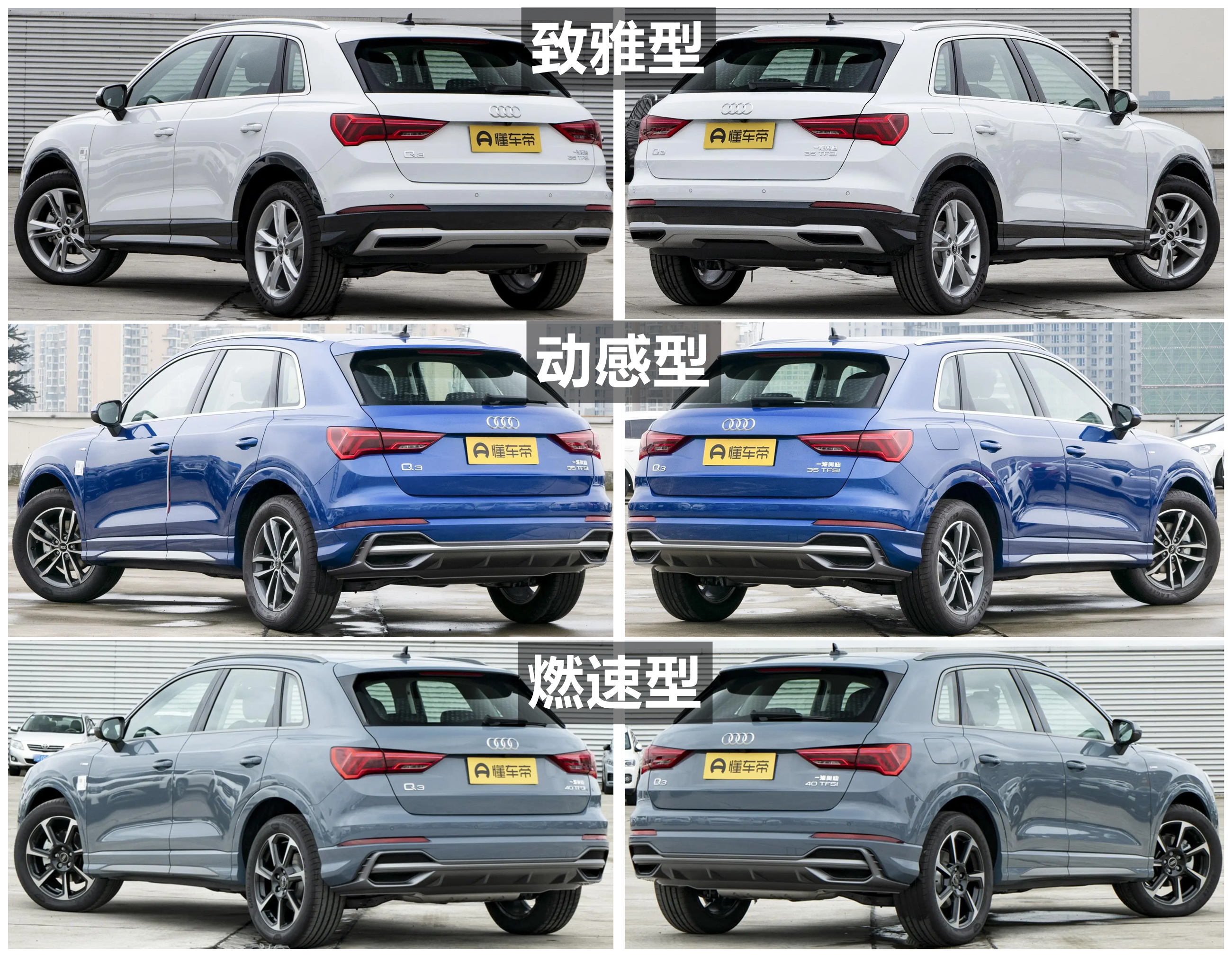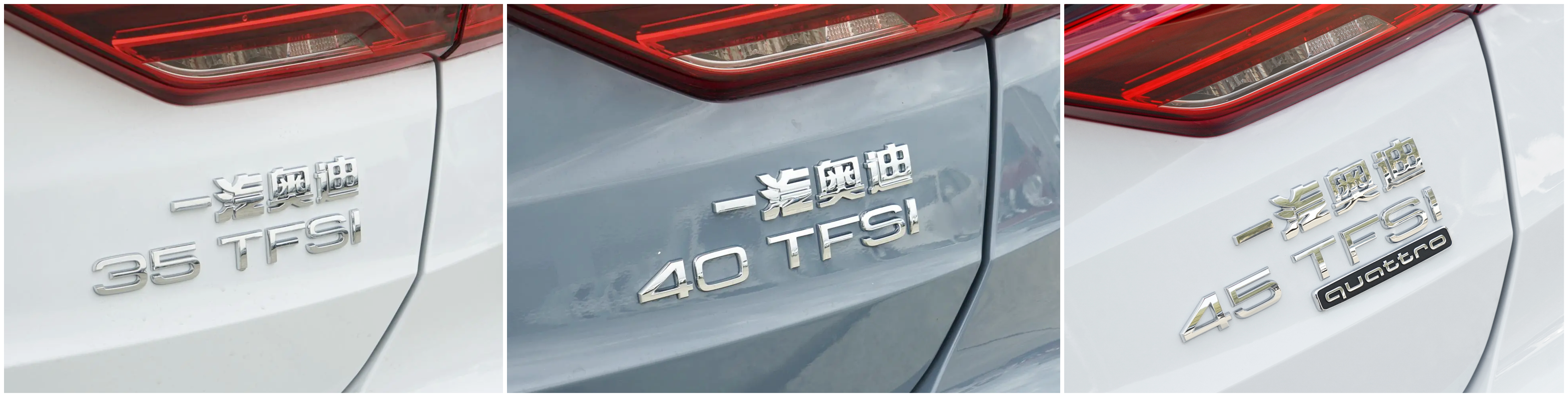 35TFSI进取动感型,35TFSI时尚致雅型和35TFSI时尚动感型的尾标是一汽奥迪+35TFSI;40TFSI时尚动感型和40TFSIRS套件燃速型的尾标是一汽奥迪+40TFSI;45TFSIquattro时尚动感型的尾标是一汽奥迪+45TFSI+quattro。