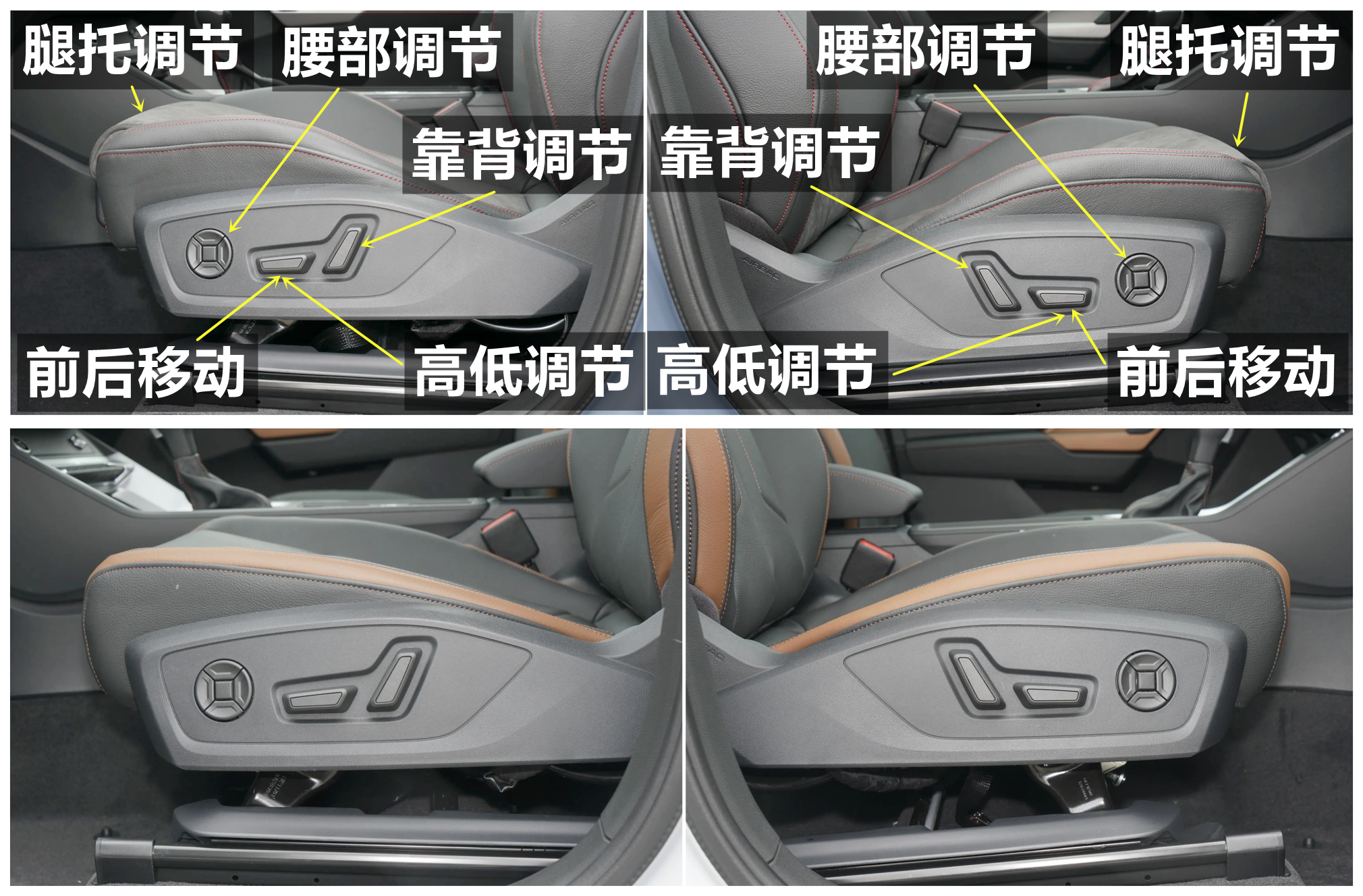 全系主驾座椅和副驾座椅都支持电动调节,主驾座椅和副驾座椅都支持前后移动,高低调节,靠背角度调节和腰部调节,头枕支持局部调节,其中35TFSI进取动感型,35TFSI时尚动感型,40TFSI时尚动感型,40TFSIRS套件燃速型和45TFSIquattro时尚动感型的前排座椅带腿托功能。35TFSI时尚致雅型的前排座椅没有腿托。