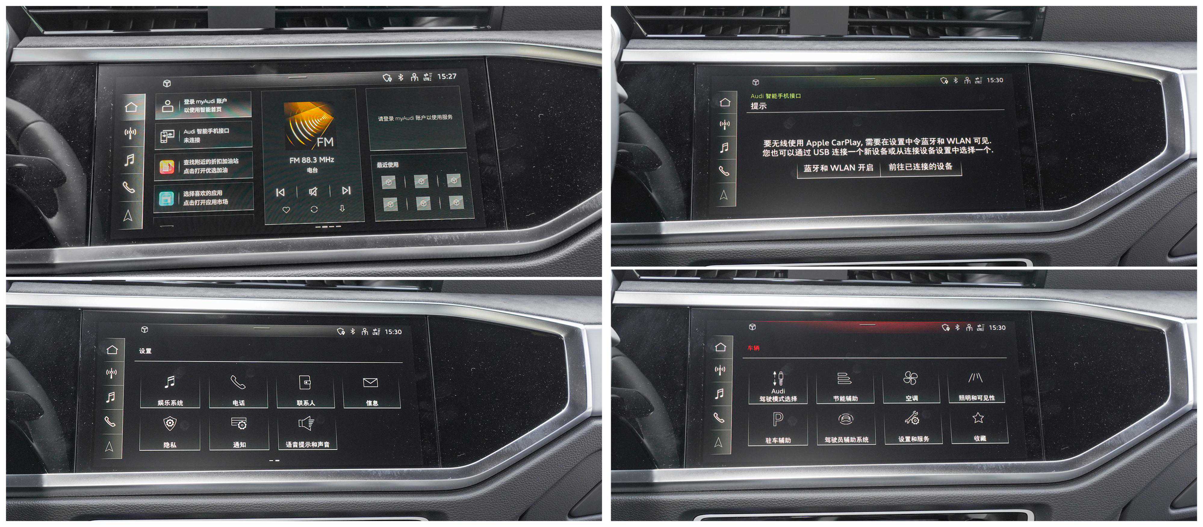 全系中控标配10.1英寸大屏,标配奥迪全新MMI®系统,车机系统带蓝牙电话和蓝牙音乐功能,Carlife,Carplay和AndroidAuto手机互联映射功能,标配语音识别控制系统。35TFSI时尚致雅型,35TFSI时尚动感型,40TFSI时尚动感型,40TFSIRS套件燃速型,45TFSIquattro时尚动感型可选装GPS导航,导航路况信息展示以及车联网功能,其中顶配45TFSIquattro时尚动感型还可选道路救援服务,35TFSI进取动感型不可选。