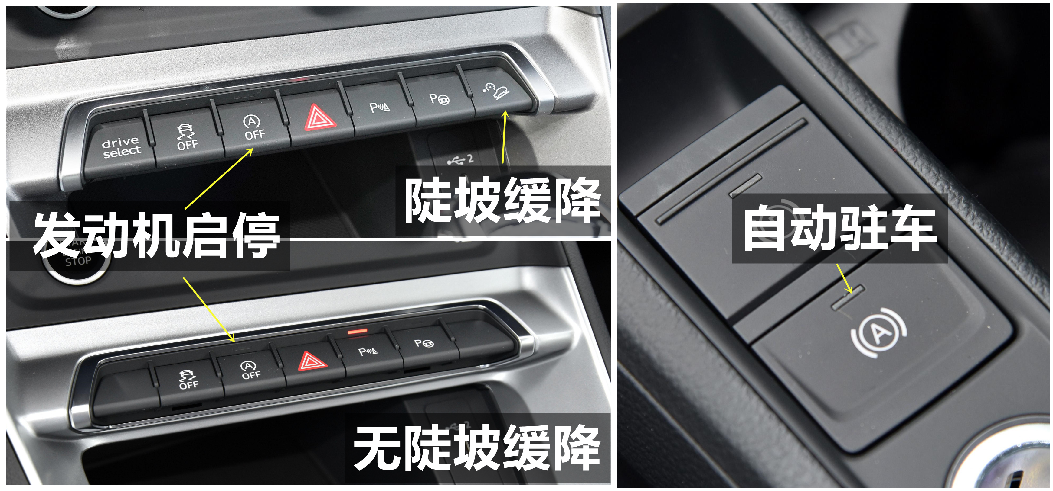 全系标配自动驻车Autohold,上坡辅助HAC以及发动机启停功能,其中顶配45TFSIquattro时尚动感型还支持陡坡缓降HDC功能,其他车型无。