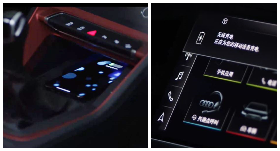 全系可选装奥迪手机盒子和信号放大天线功能,包括手机无线充电(2000元),选装之后,把手机置于挡把前方的置物板上,手机可以无线充电,同时手机无线电信号会放大,天线信号收发能力更强。