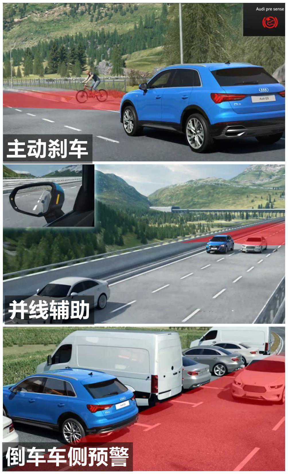 全系标配主动刹车和前方碰撞预警功能。除了35TFSI进取动感型以为,其他车型标配疲劳驾驶提示;除了35TFSI进取动感型之外,其他车型可选装车道偏离预警,并线辅助,倒车车侧预警,车道保持等功能。