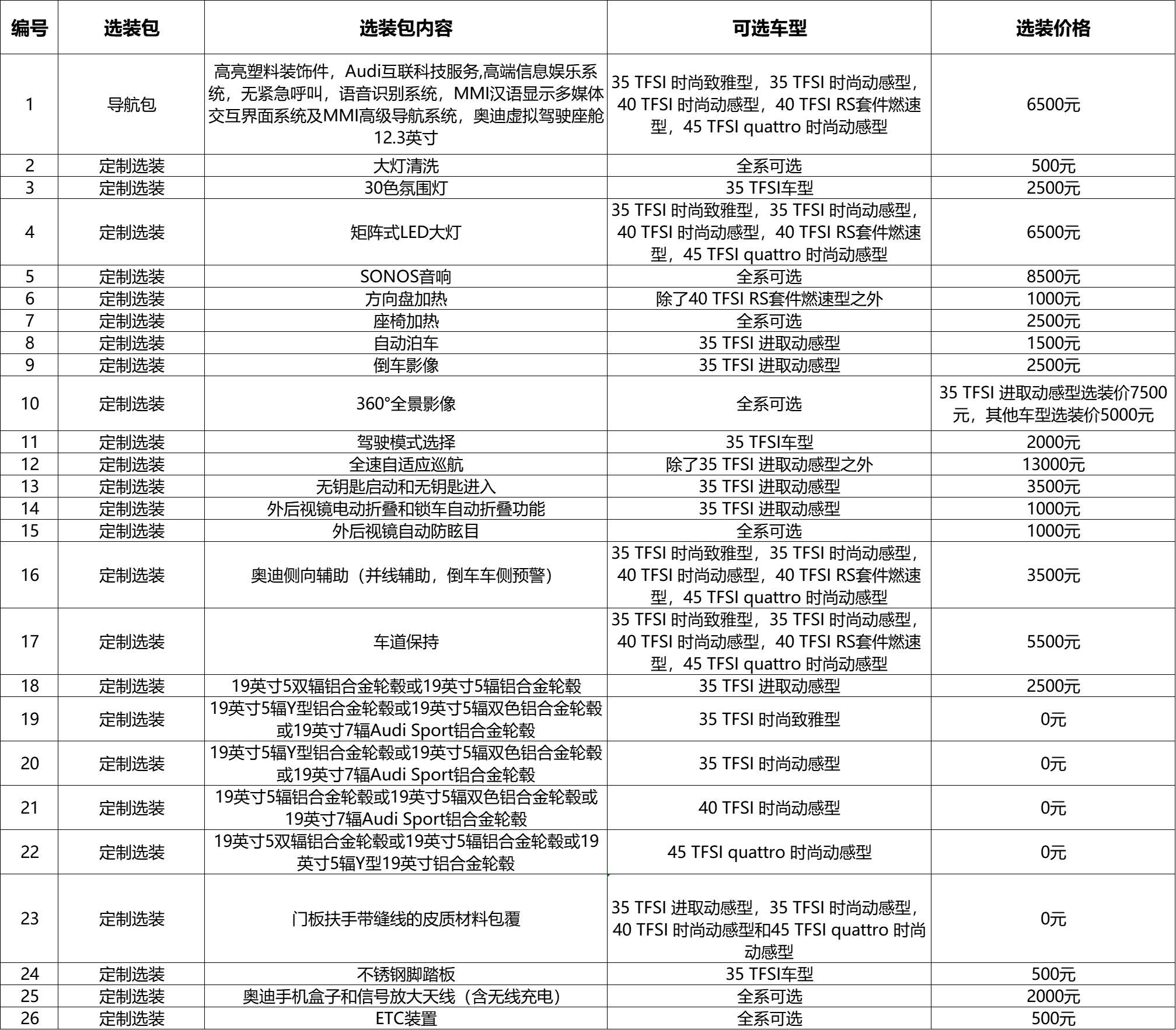轮毂,35TFSI进取动感型配备18英寸5双辐铝合金轮毂,可选装19英寸5双辐铝合金轮毂或19英寸5辐铝合金轮毂(2500元);35TFSI时尚致雅型配备19英寸5双辐铝合金轮毂,可免费选装19英寸5辐Y型铝合金轮毂或19英寸5辐双色铝合金轮毂或19英寸7辐AudiSport铝合金轮毂;35TFSI时尚动感型配备19英寸5辐铝合金轮毂,可免费选装19英寸5辐Y型铝合金轮毂或19英寸5辐双色铝合金轮毂或19英寸7辐AudiSport铝合金轮毂;40TFSI时尚动感型配备19英寸5辐Y型铝合金轮毂,可免费选装19英寸5双辐寸铝合金轮毂或19英寸5辐铝合金轮毂或19英寸5辐双色铝合金轮毂或19英寸7辐AudiSport铝合金轮毂;40TFSIRS套件燃速型配备19英寸7辐AudiSport铝合金轮毂;45TFSIquattro时尚动感型配备19英寸5辐双色铝合金轮毂,可免费选装19英寸5双辐寸铝合金轮毂或19英寸5辐铝合金轮毂或19英寸5辐Y型铝合金轮毂。