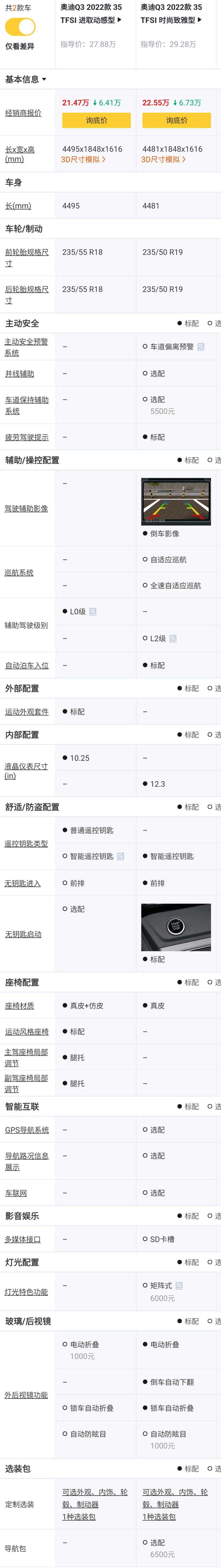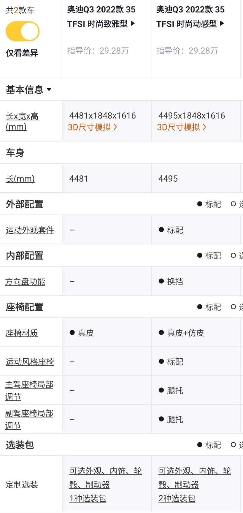 35TFSI时尚致雅型对比35TFSI进取动感型,价格+1.4万元,车长缩短14mm,轮胎从235/55R18升级到235/50R19,多了疲劳驾驶提示,多了倒车影像和自动泊车,少了运动外观套件,仪表从10.25英寸升级到12.3英寸,观感更好,多了前排无钥匙进入和无钥匙启动功能,座椅从真皮和麂皮混搭座椅升级为真皮座椅,但少了运动风格座椅,前排座椅少了腿托功能,外后视镜多了电动折叠,锁车自动折叠和倒车自动下翻功能,老实说,这多出来的配置不值1.4万元,但增加的配置又比较实用,还是建议升级。