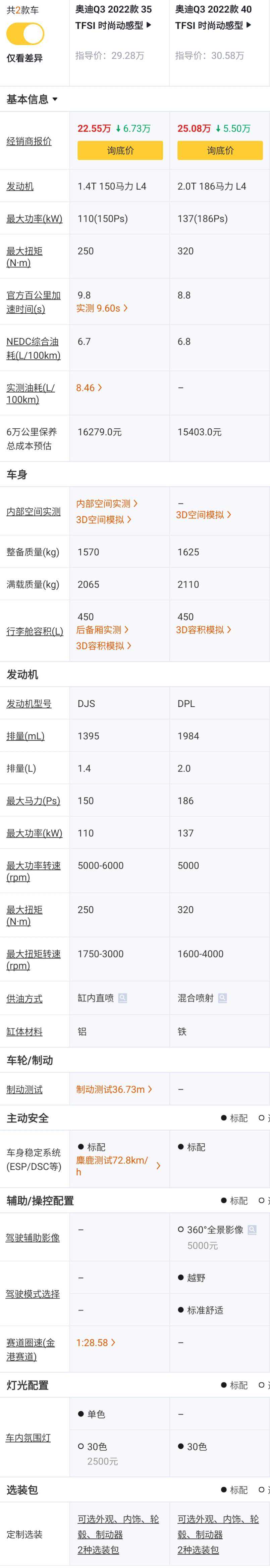 40TFSI时尚动感型对比35TFSI时尚动感型,价格+1.3万元,发动机从1.4T升级到2.0T低功率,马力从150Ps升级到186Ps,百公里加速时间从9.8s升级到8.8s,缸体材料从铝合金变更为铁缸体,驾驶模式增加越野,舒适,自动,动态和个性化选择,车内氛围灯从单色升级到30色,晚上点亮效果要更好,这1.3万元主要花在了发动机升级上,虽然升级的2.0T是低功率版本,但动力还是要比1.4T好不少,建议升级。