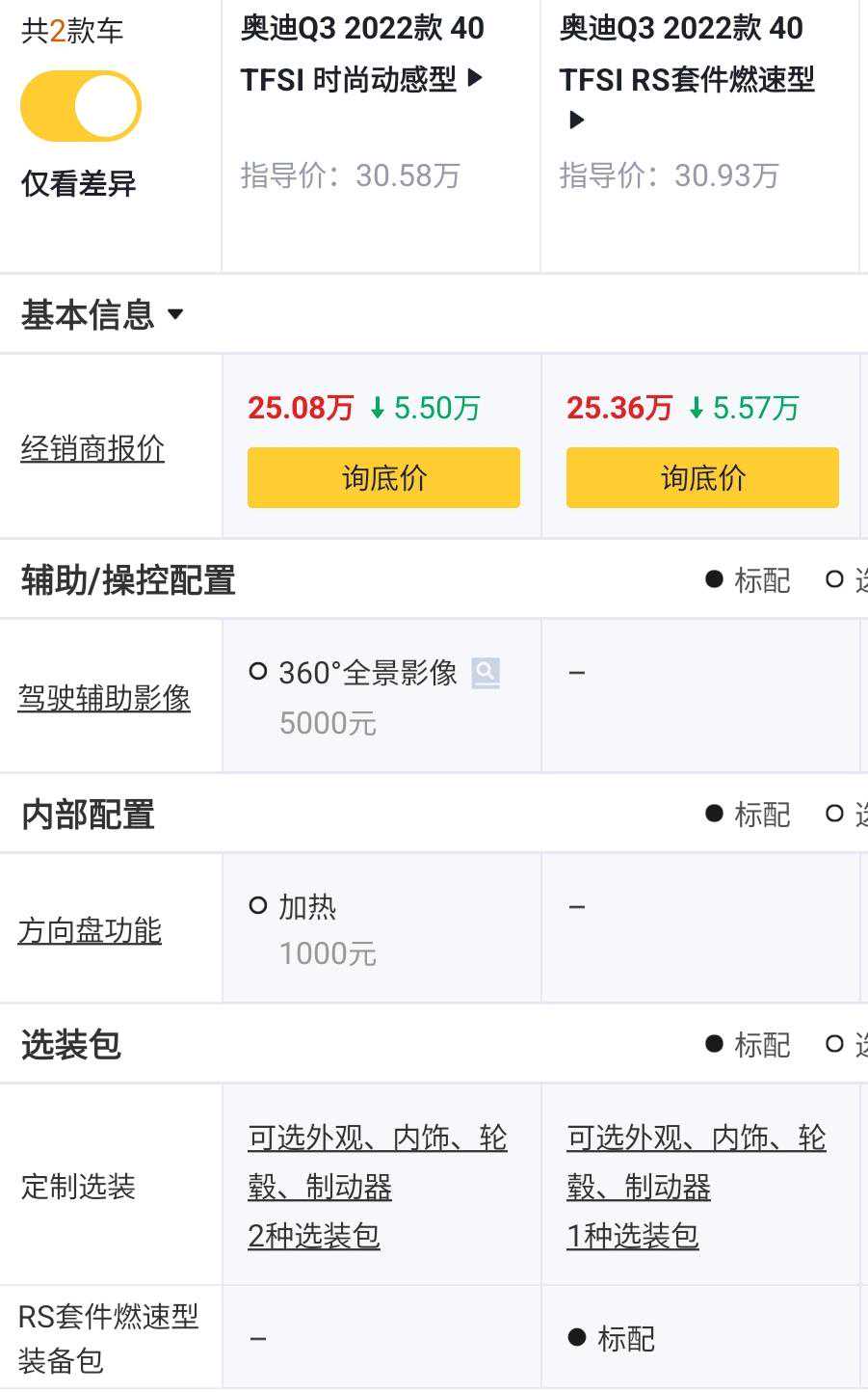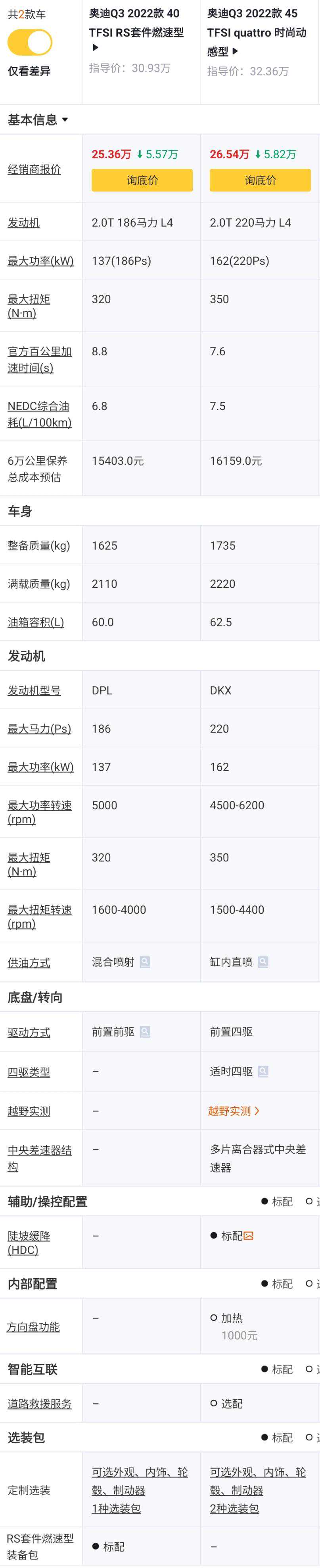45TFSIquattro时尚动感型对比40TFSIRS套件燃速型,价格+1.43万元,发动机从2.0T低功率升级到2.0T高功率,马力从186Ps升级到220Ps,百公里加速时间从8.8s提升到7.6s,前置前驱升级位quattro适时四驱,多了陡坡缓降功能,少了RS燃速套件,个人觉得2.0T高功率动力表现更好,而且增加的quattro四驱系统在提升动力性以及通过性方面表现也非常好,如果预算够的话,直接购买顶配。