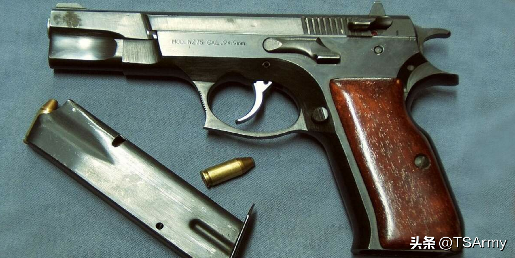 8、NP24/20型手枪NP24/20手枪是根据77B型手枪的基础上改进而来,同样发射9×19毫米手枪弹,但这个型号并没有继承77式快速上膛的功能,本质上就是一种正常的半自动手枪,其中的24型采用双排弹匣供弹,容量更大,而20型是单排弹匣供弹,其余的构造和外形基本上都是相同的。
