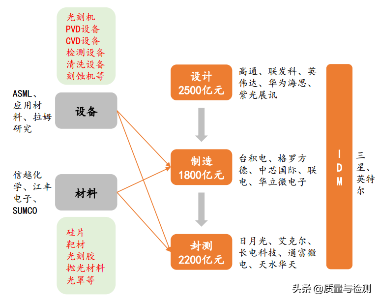 半导体生产主要分为设计、制造、封测三大流程,同时需要用到半导体材料和设备。