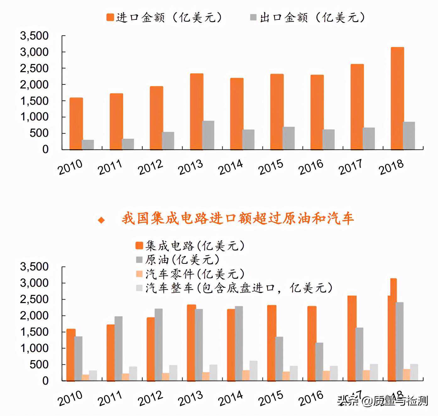 从进出口来看,2018年我国集成电路进口3121亿美元,出口846亿美元,贸易逆差高达2275亿美元。近年来,我国集成电路进口金额超过原油、汽车整车和汽车零部件。