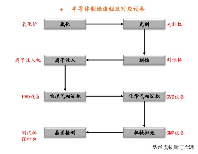 晶圆加工流程包括氧化、光刻和刻蚀、离子注入和退火、气相沉积和电镀、化学机械研磨、晶圆检测。所用设备包括氧化/扩散炉、光刻机、刻蚀机、离子注入机、薄膜沉积设备(PVD和CVD)、检测设备等。