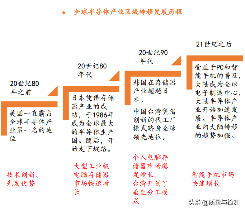 回顾历史,全球半导体产业发展经历过由美国向日本、向韩国和中国台湾地区几轮转移,未来几年预计将大面积向大陆转移。