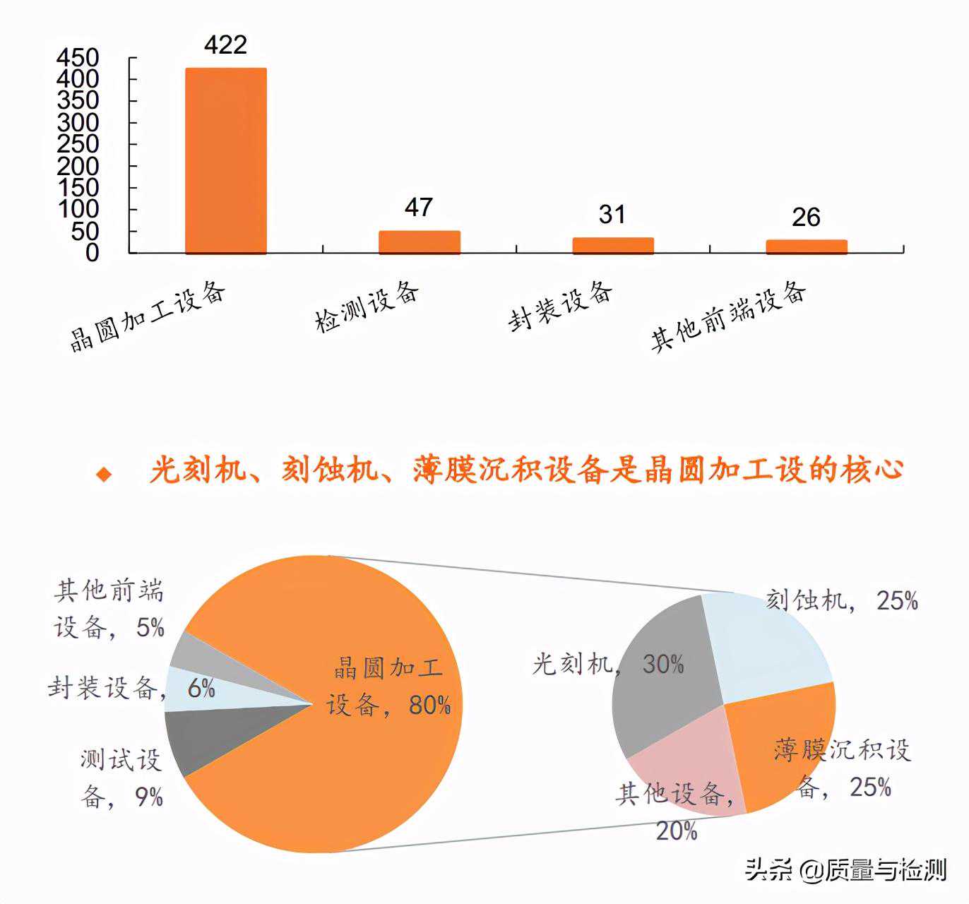 半导体设备分为晶圆加工设备、检测设备、封装设备和其他设备。SEM1预计,2019年全球晶圆加工设备、检测设备和封装设备市场规模分别为422亿美元、47亿美元和31亿美元。晶圆加工设备是主要设备,占全部设备比重约80%