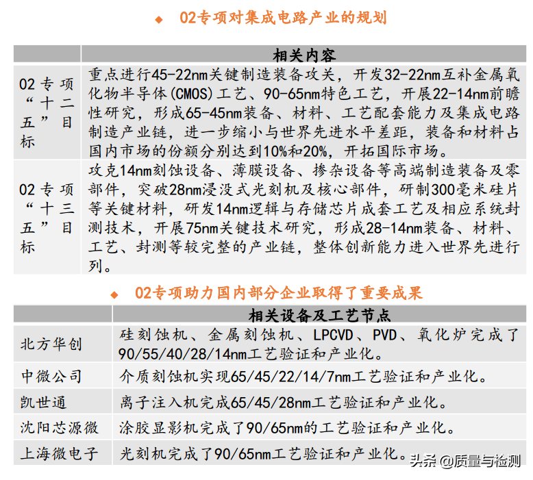 针对半导体产业,国务院于“十二五”规划期间推出“极大规模集成电路制造装备及成套工艺”重大专项(简称"02专项”),旨在突破集成电路制造装备、材料、工艺、封测等核心技术。“02专项”启动了多个重大课题,集中资金和人力发展半导体装备、材料等产业。