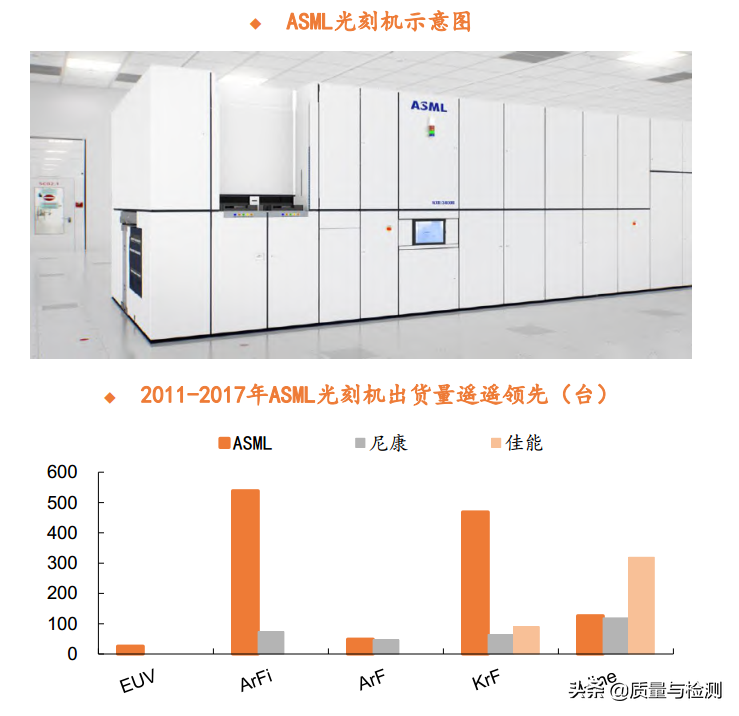 光刻的本质是把电路结构图复制到硅片上的光刻胶上,方便之后进行刻蚀和离子注入。从集成电路诞生之初,光刻就被认为是集成电路制造工艺发展的驱动力。全球光刻机市场主要由荷兰的阿斯麦(ASML)、日本尼康和佳能三家把持,其中ASML更是全球绝对龙头,市占率超过67%,几乎断了高端光刻机(EUV)市场。日本尼康和佳能产品主要为中低ि机型。
