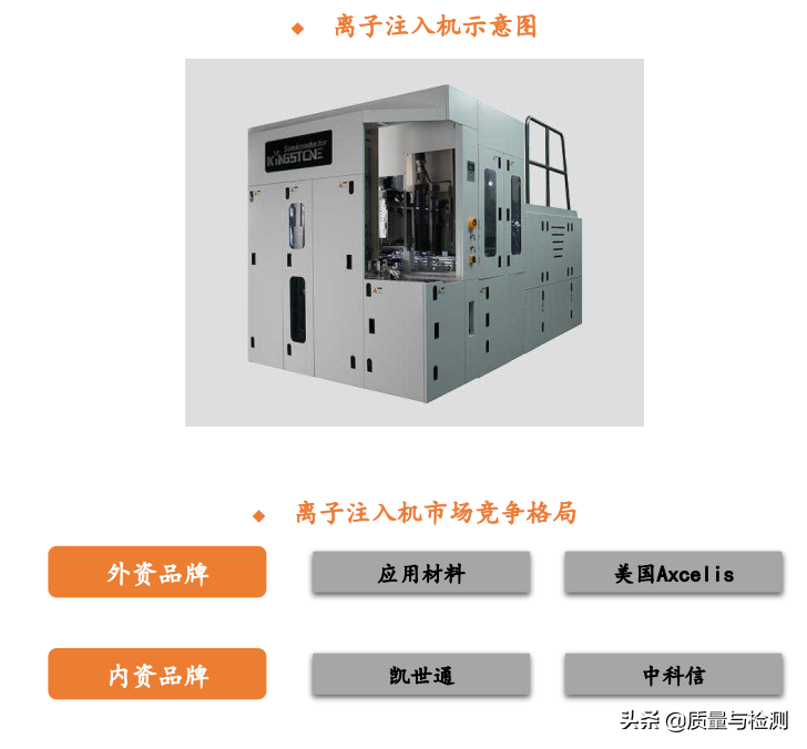 全球离子注入机龙头为美国应用材料和Axcelis公司,两家合计占据全球近90%的市场份额。国内企业中,只有凯世通和中科信具备集成电路离子注入机的研研发和生产能力。目前凯世通离子注入机广泛运用于太阳能电池、AMOLED等领域,属于国内领先,集成电路离子注入机目前正处于验证阶段。