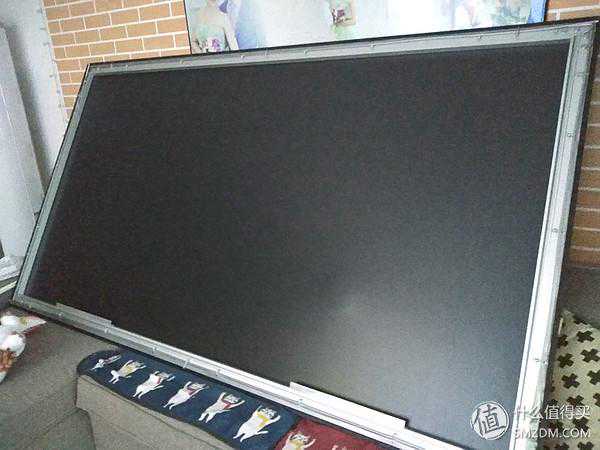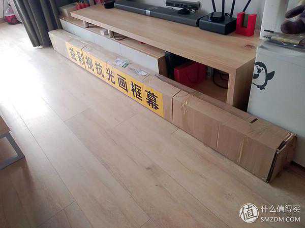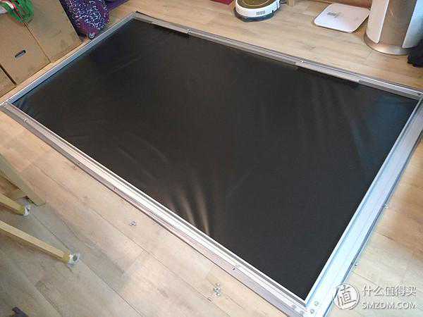 要注意的是黑色是背面,而且地上最好铺上防护以免地面有脏东西对幕面造成污染以及划痕等等,其实卷幕布的那个半透明的布就可以,可我没领会到精神给整坏了,不管三七二十一,先装上再说,如图所示幕布与边框刚刚好的样子,有褶皱是不行的光线反射不均匀会有水波纹以及亮暗不清晰的情况。
