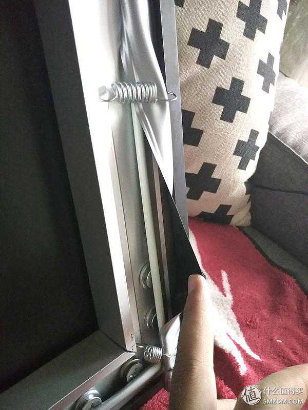 而这个银色面则是幕布的正面,我不禁陷入了疑虑,在网上看都是类似电视的黑色屏幕,这大灰色岂不是很影响挂墙感受。如图所示纤维拉杆是插入到幕布边上预留通道中。