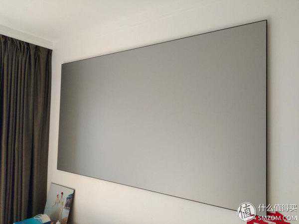 可以看出我家属于非常简单的装修,所以墙面如果没有幕布一块大白墙有点太空了,虽然幕面是银灰色但是挂在墙上之后就有一些大电视的感觉了,虽然没有电视那么纯黑但是整体感觉也是比较震撼的,发到朋友圈大家都在问什么牌子电视这么大呀~~