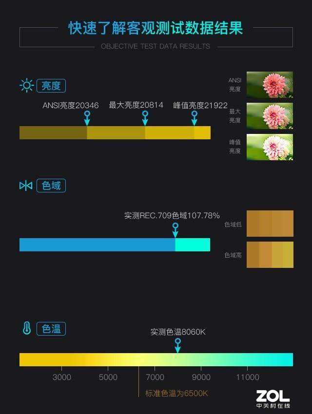 NECPX2000UL+工程投影机的实测色域高达107.78%,能够显示出更多颜色;实测色温为8060K,画面显得更为通透,白色看起来也更加纯净,这种色彩风格更符合中国用户的审美。