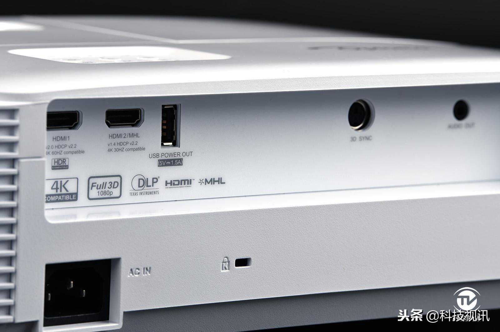 随后在接口的选择上,奥图码HD27H的配置简洁明了,配备了2个HDMI,HDMI1为2.0版本,支持,支持4K60HZ信号输入;HDMI2为1.4a版本,支持4K30HZ信号输入,也支持MHL;1个3.5mm音频输出接口;1个3D同步接口(3DSYNC接口);1个支持5V/1.5A功率的USBA接口,可替手机平板充电,并驱动HDMI无线影音传输器。