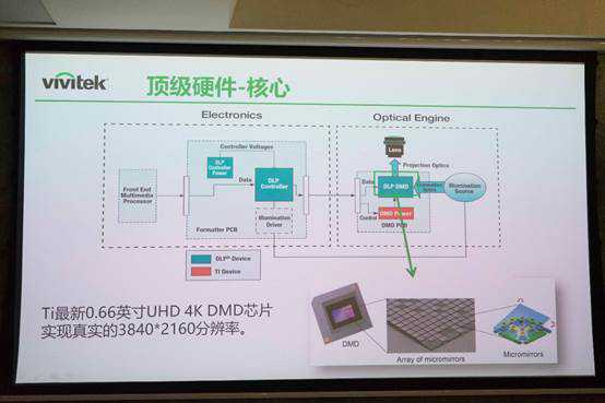 Vivitek(丽讯)HK2288作为一款真4K投影机,采用的是TI(德州仪器)的DLP技术,搭载了最新的0.66英寸UHD4KDMD芯片。之所以称之为真4K,是因为DLP4KUHD解决方案凭借芯片的速度优势及高级图像处理能力,利用4百万个微镜将超过8百万个像素传送到屏幕上。每个微镜可在一秒内切换超过9000次,从而在屏幕上的每一帧内都生成两个完全不同且唯一的像素,以实现全4KUHD分辨率(3840*2160)。