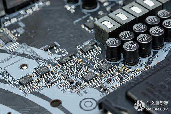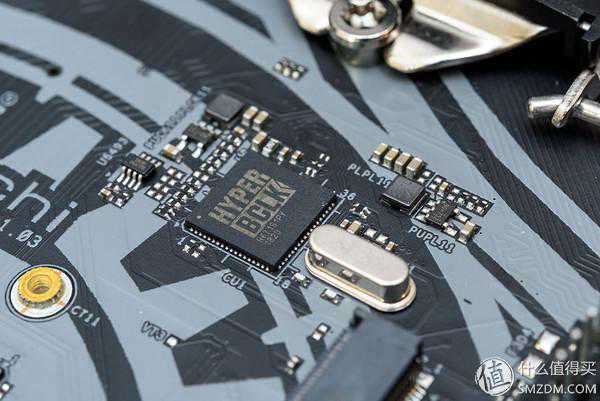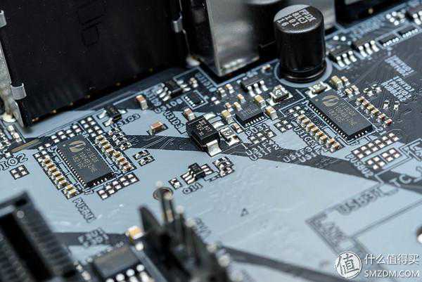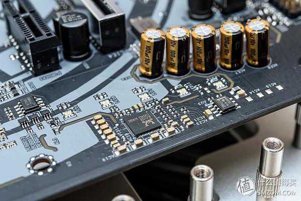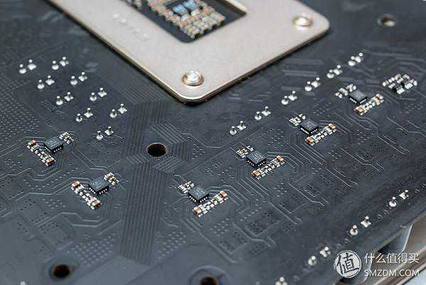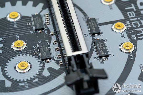 主板PCI-EX16插槽末端两边各有两颗L04083B芯片,用于桥接显卡插槽的带宽,以支持显卡8+8双卡模式。
